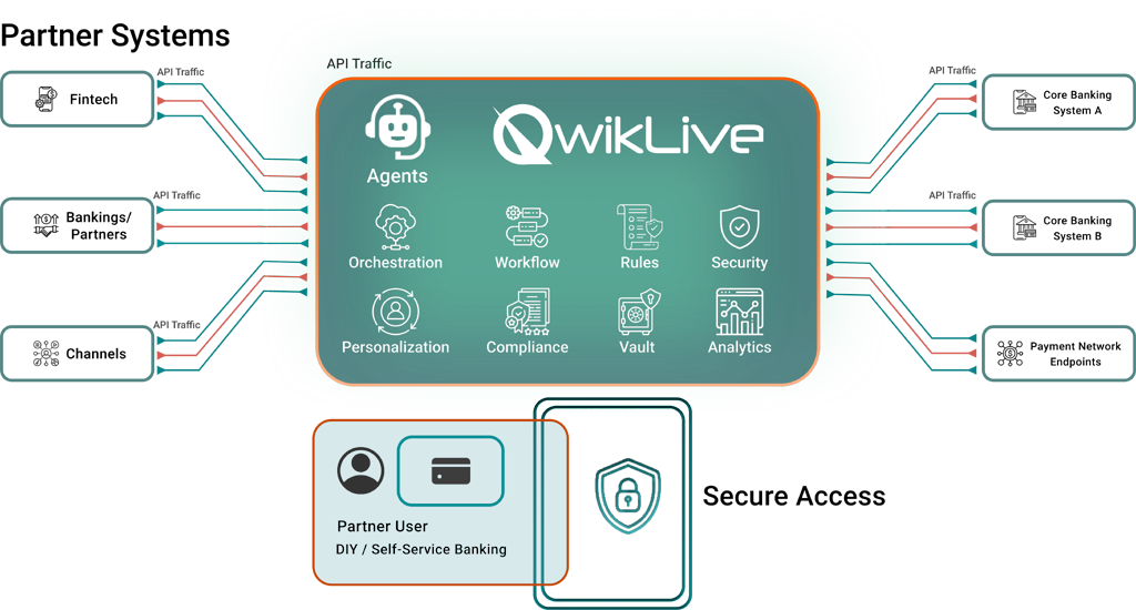 QwikLive Core™ transforms banking integration by harmonizing disparate banking and payment core systems, regardless of technology or API differences into a unified, intelligent platform. Powered by Agentic AI, it enables build, deploy, and management of financial applications under strict platform guardrails and compliance, delivering seamless orchestration and standardized workflows for fintech-speed innovation.